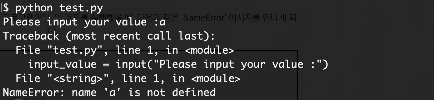 사용자로부터 입력을 받아 그대로 화면에 출력해주는 프로그램이다. 이 코드를 실행했을 때, 다음 화면처럼 'NameError' 메시지를 만나게 되는 경우가 있다.