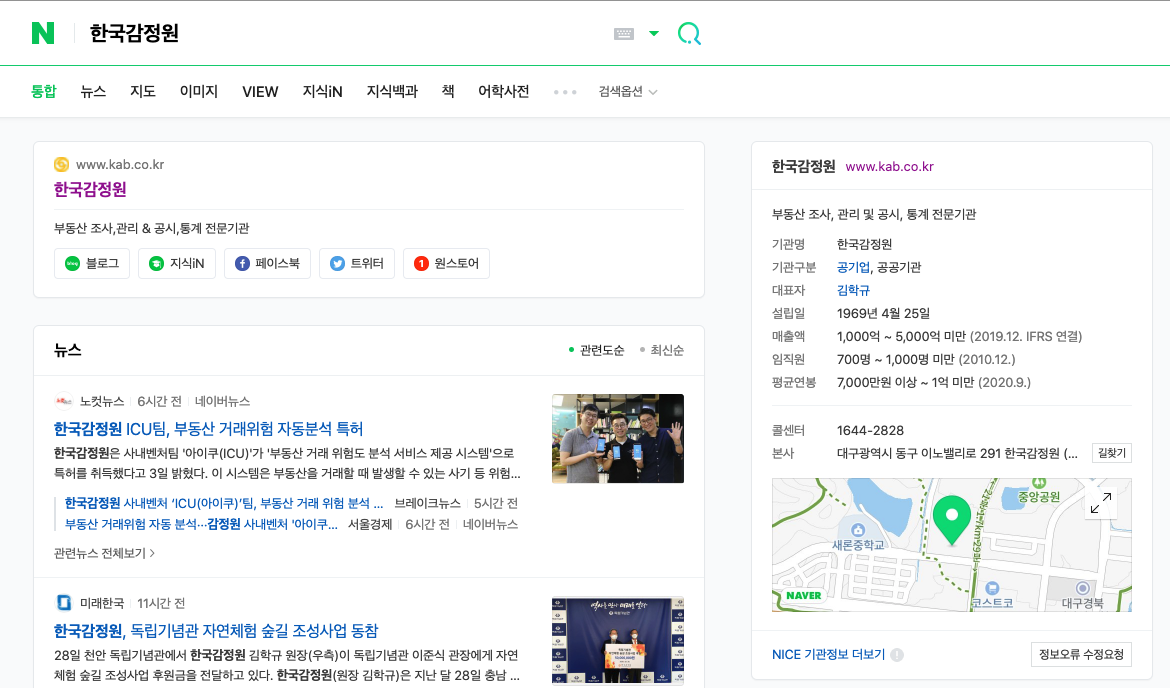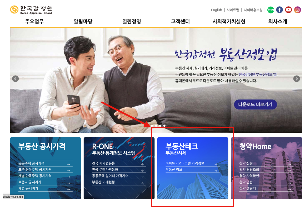 포털에서 '한국감정원'을 검색하면 홈페이지 주소를 얻을 수 있다.