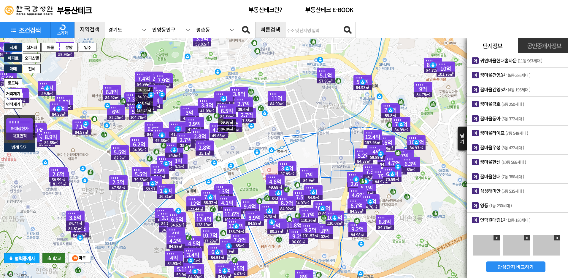 지역별 아파트 분석을 클릭해보면 특정 지역을 선택해서 부동산 통계정보를 조회해볼 수 있는 페이지가 나온다. 평촌에 대한 정보를 조회해보면,