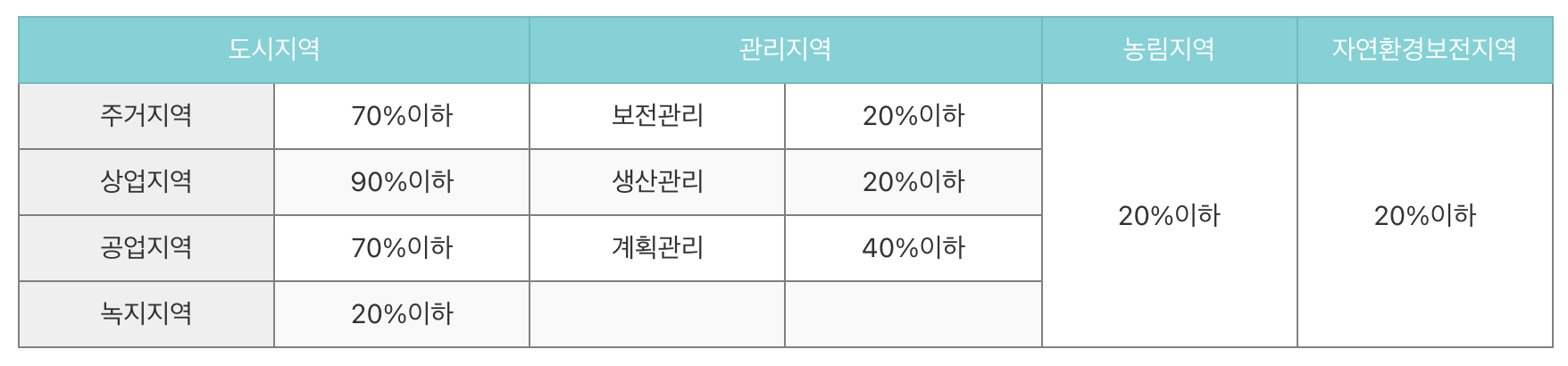 용도지역들은 더 상세하게 나뉘기도 하는데요. 정확한 건폐율 제한은 지자체의 조례와 토지의 세분화된 용도지역에 따라 다릅니다. (참고글 : [부동산 공부] 1종, 2종, 3종 일반주거지역과 준주거지역, 전용주거지역의 차이점)