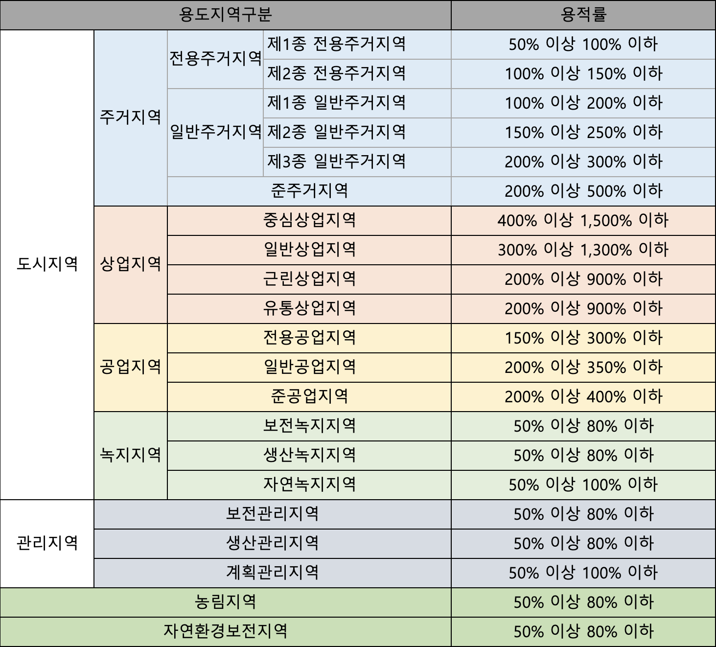 건폐율과 마찬가지로 용적률 역시 일정 수준 이하를 유지하도록 규제하고 있습니다. 토지의 용도지역 구분에 따라 용적률은 다음과 같이 규제됩니다.