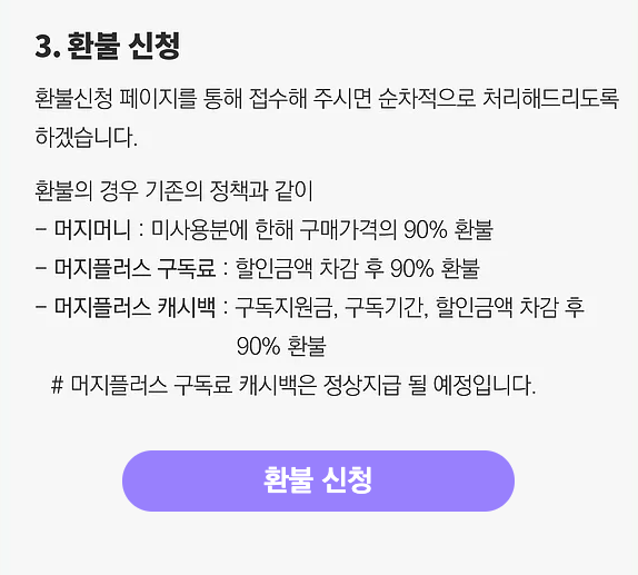 또 한, 환불을 원할 경우 절차에 따라 순차적으로 처리해주겠다고 공지도 올렸습니다. (환불을 원하면 머지머니 미사용분에 한해 구매가격의 90%를 돌려주겠다고 밝혔습니다)