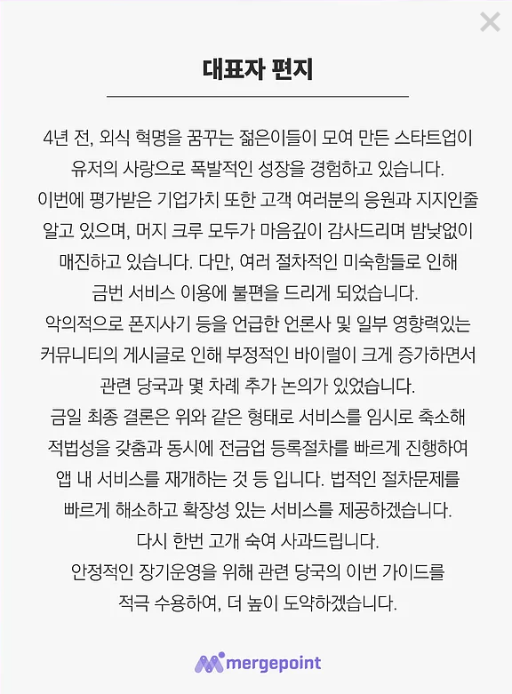 머지포인트의 사용이 많았던 편의점과 대형 마트 등의 결제를 예고 없이 일방적으로 끊어 버린 것인데요. 남은 머지포인트를 사용할 수 있는 곳이 일부 영세한 로컬 매장만 남아 하루아침에 사용하기 힘든 포인트가 되어버렸습니다. 이어 법적 문제가 없다는 결론이 나올때까지 충전형 모바일 바우처인 '머지머니'의 판매는 중단되고, 사용한도도 제한되었습니다. 구독형 할인 서비스인 '머지 플러스'도 할인 혜택 이용이 중단되었습니다.