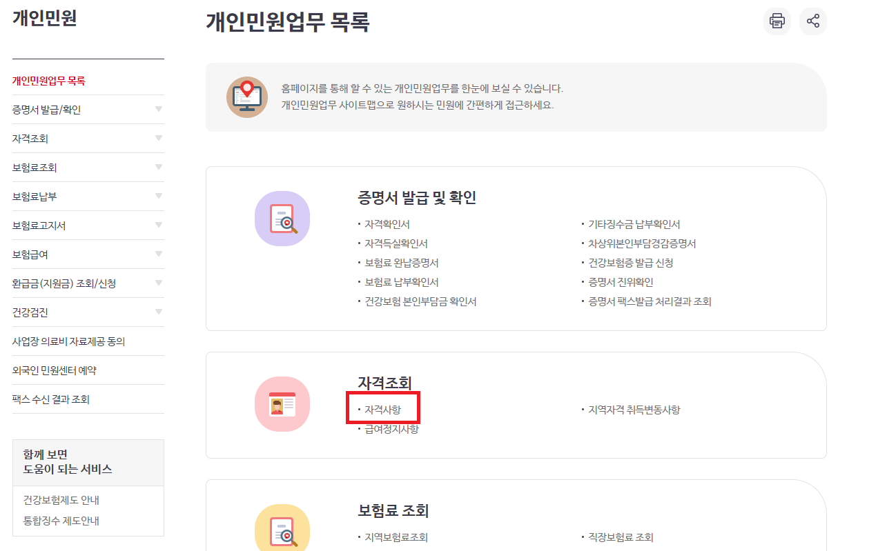 '개인민원업무 목록' 중에 '자격조회' - '자격사항' 항목을 클릭합니다.