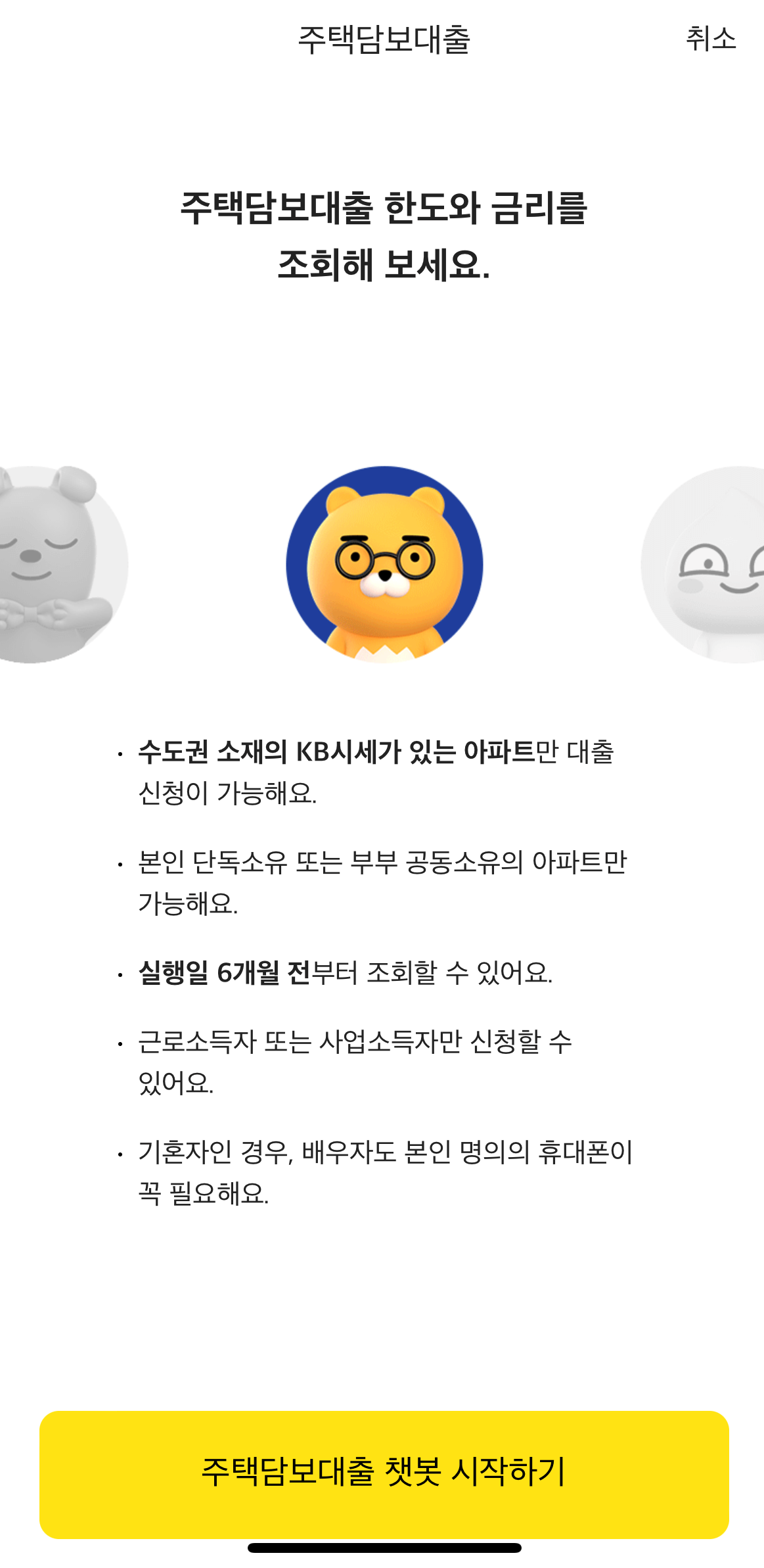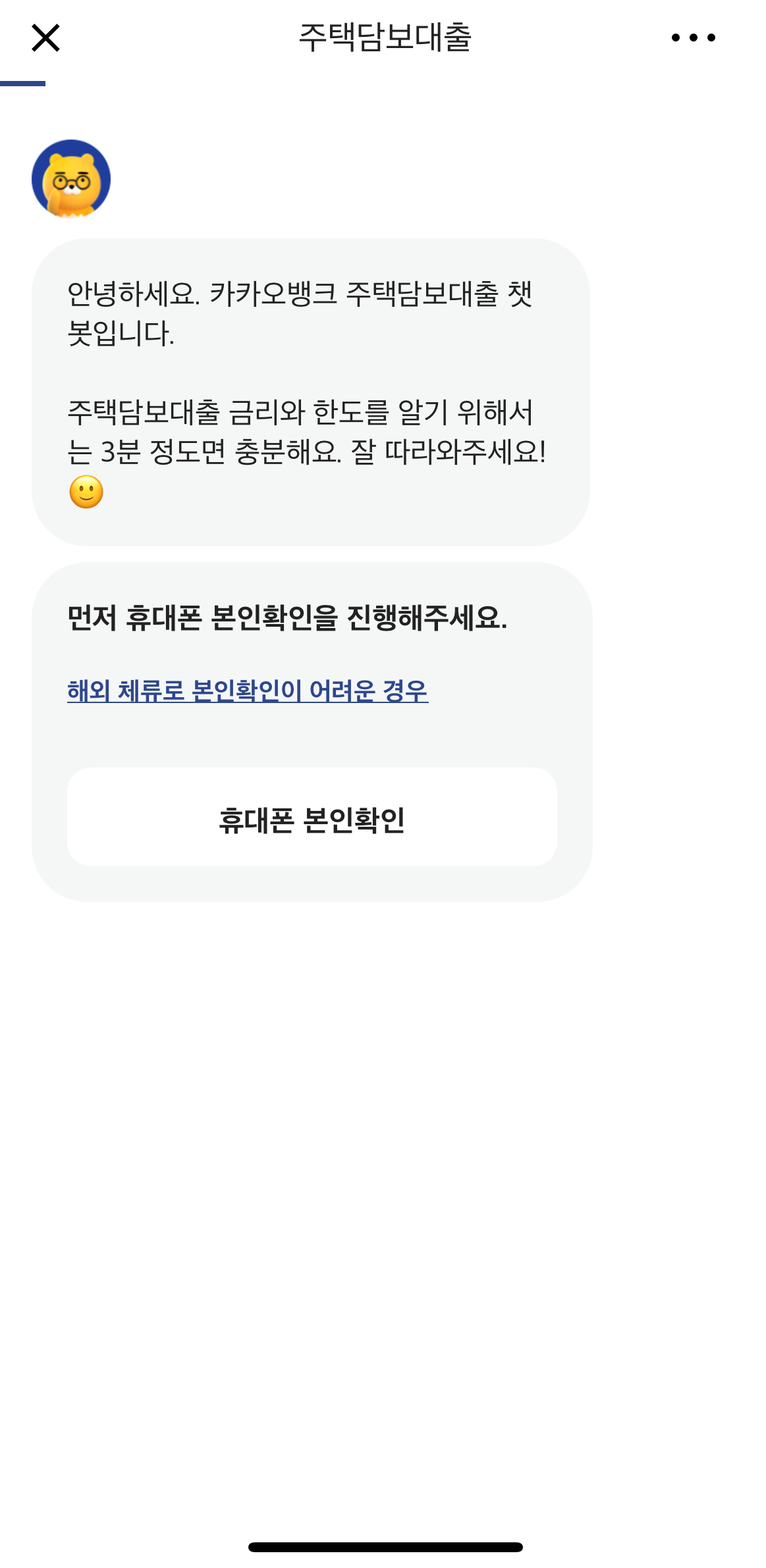 카카오뱅크 앱에서 이벤트 팝업이나 주담대상품을 조회하다보면 챗봇 시작하기 메뉴가 있습니다. 챗봇을 시작하면 챗봇이 이것저것 묻게 됩니다.