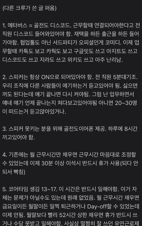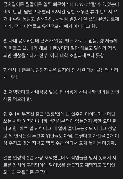 여기에 기존 월 근무 시간만 채우면 근무시간을 마음대로 조정할 수 있는 유연 근무제가 있었는데 폐기되고 30분 이상 자리를 비울 경우 반드시 휴가를 사용해야 한다고 합니다.