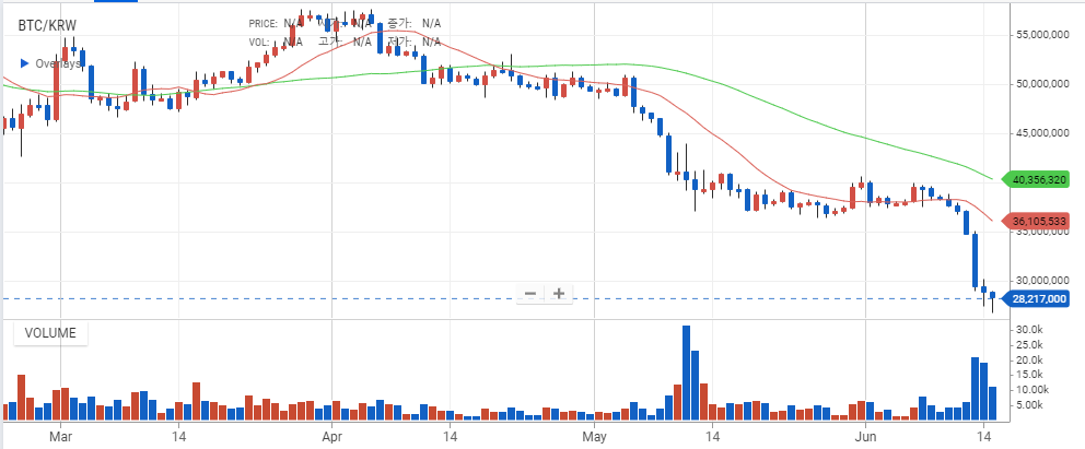 4월 초 5600만원 인근이었던 비트코인(BTC)의 시세가 점점 떨어지더니 미국의 금리인상이 임박한 6월 14일에는 3000만원이 깨지면서 2000만원대까지 시세가 폭락했습니다.