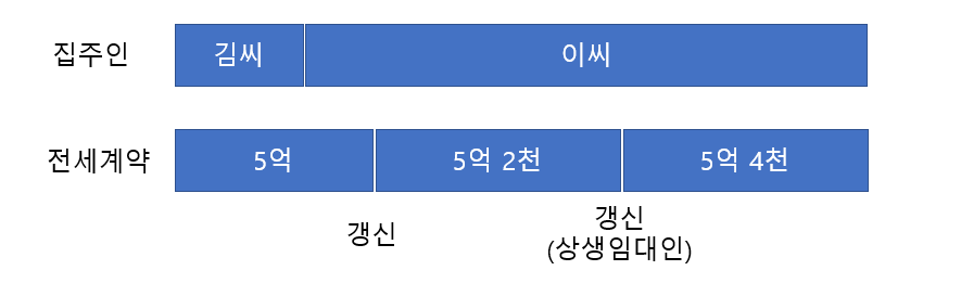 예를 들어 김씨가 가지고 있는 아파트에 5억의 전세계약이 있었다고 해보면, 이 매물을 이씨가 매수할 수 있습니다. 이 경우 기존 5억원의 전세계약은 이씨가 승계해서 만기가 보장됩니다. 이후 5억 전세 계약이 만료되고 5억 2천으로 보증금을 올리면 5% 이내로 보증금을 올렸지만 직전 계약인 5억 전세가 이씨 명의로 시작된게 아니므로 이씨는 5억 2천 계약에서 상생임대인 자격을 얻지 못합니다.