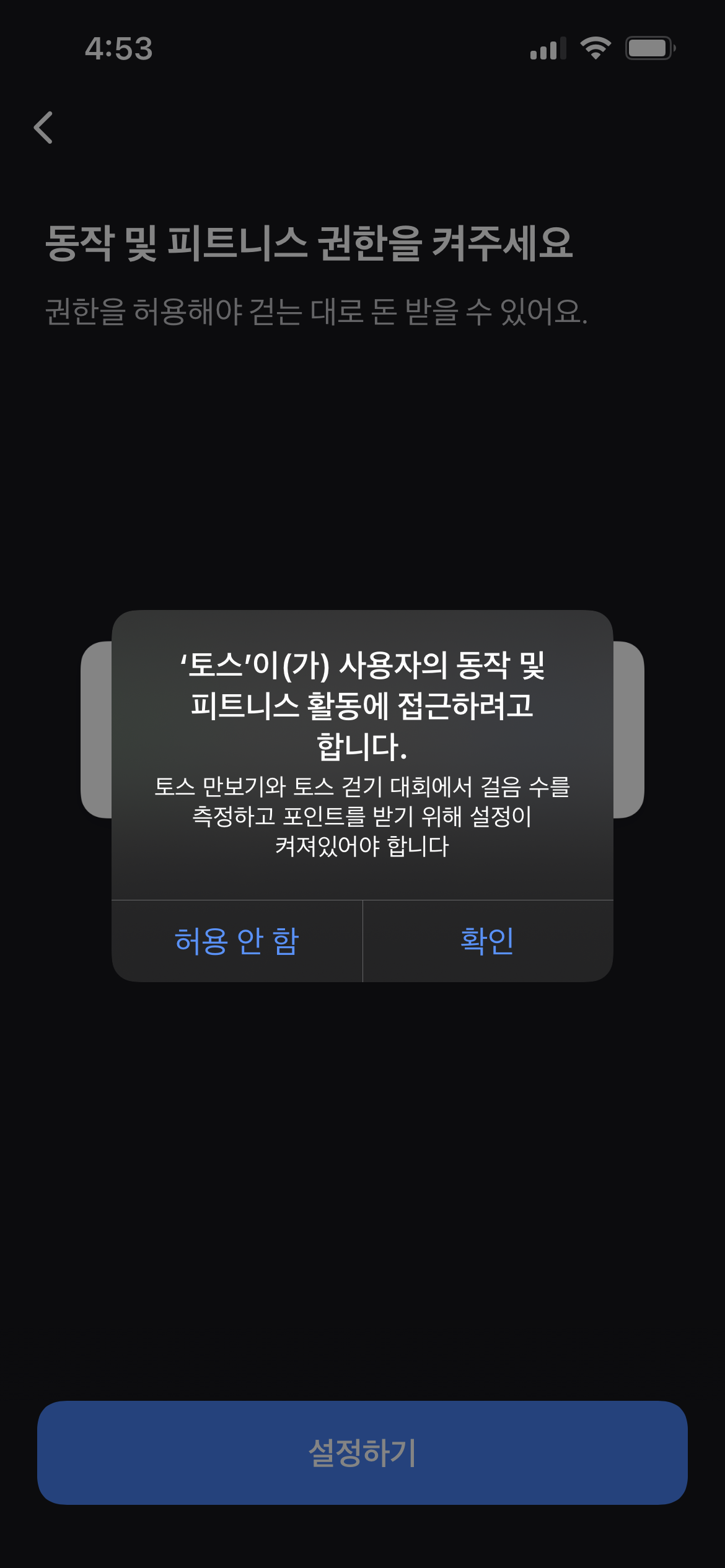 아이폰의 경우 토스에서 사용자의 동작 및 피트니스 활동 정보에 접근하도록 허용을 해줘야 합니다. 아이폰 사용자의 활동 정보도 개인정보이기 때문에 철저하게 지켜지고 있습니다.