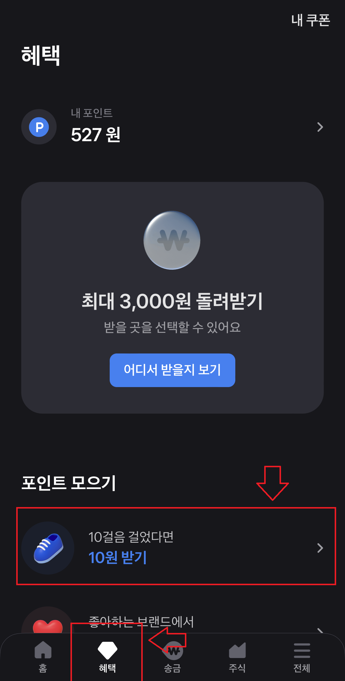 토스 만보기 기능은 토스 앱의 '혜택' 탭에서 '포인트 모으기' 항목에 있습니다. 신발 모양의 아이콘이 있고, "10걸음 걸었다면 10원 받기" 항목을 클릭하면 사용할 수 있습니다.