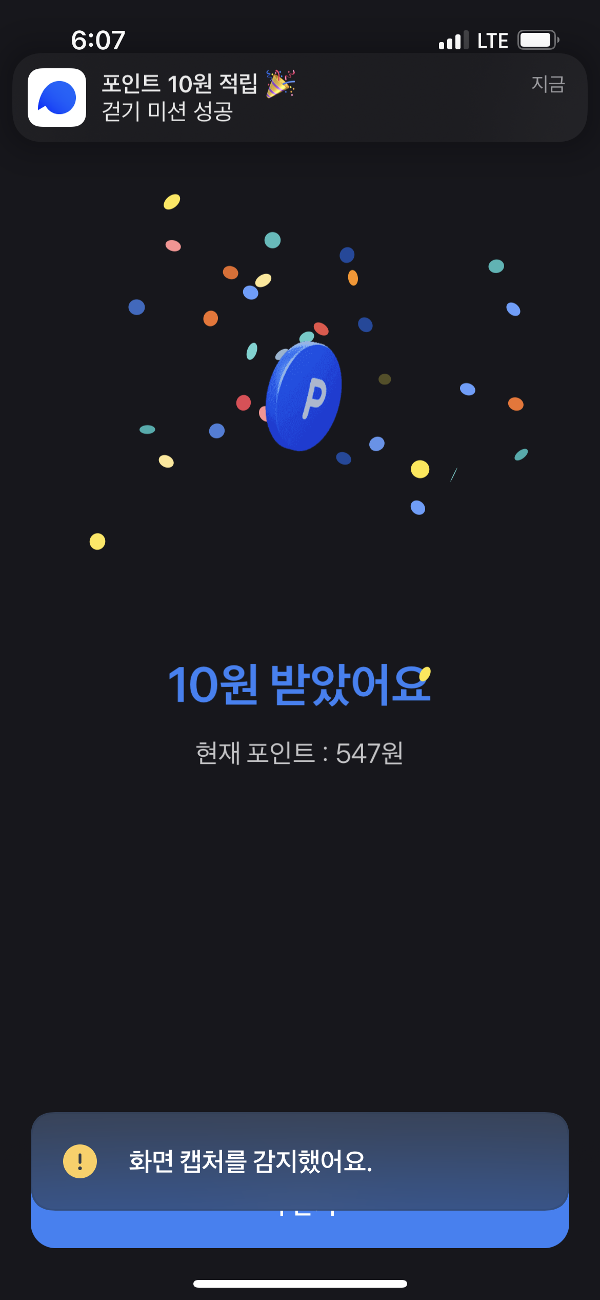 걸음걸이로 받을 수 있는 포인트는 10걸음째에 10원, 5,000걸음에 10원 마지막으로 10000걸음을 채우면 20원을 지급합니다. 걸음걸이 숫자가 누적되면 포인트를 받을 수 있는 버튼이 활성화되고 누르면 포인트가 지급됩니다.