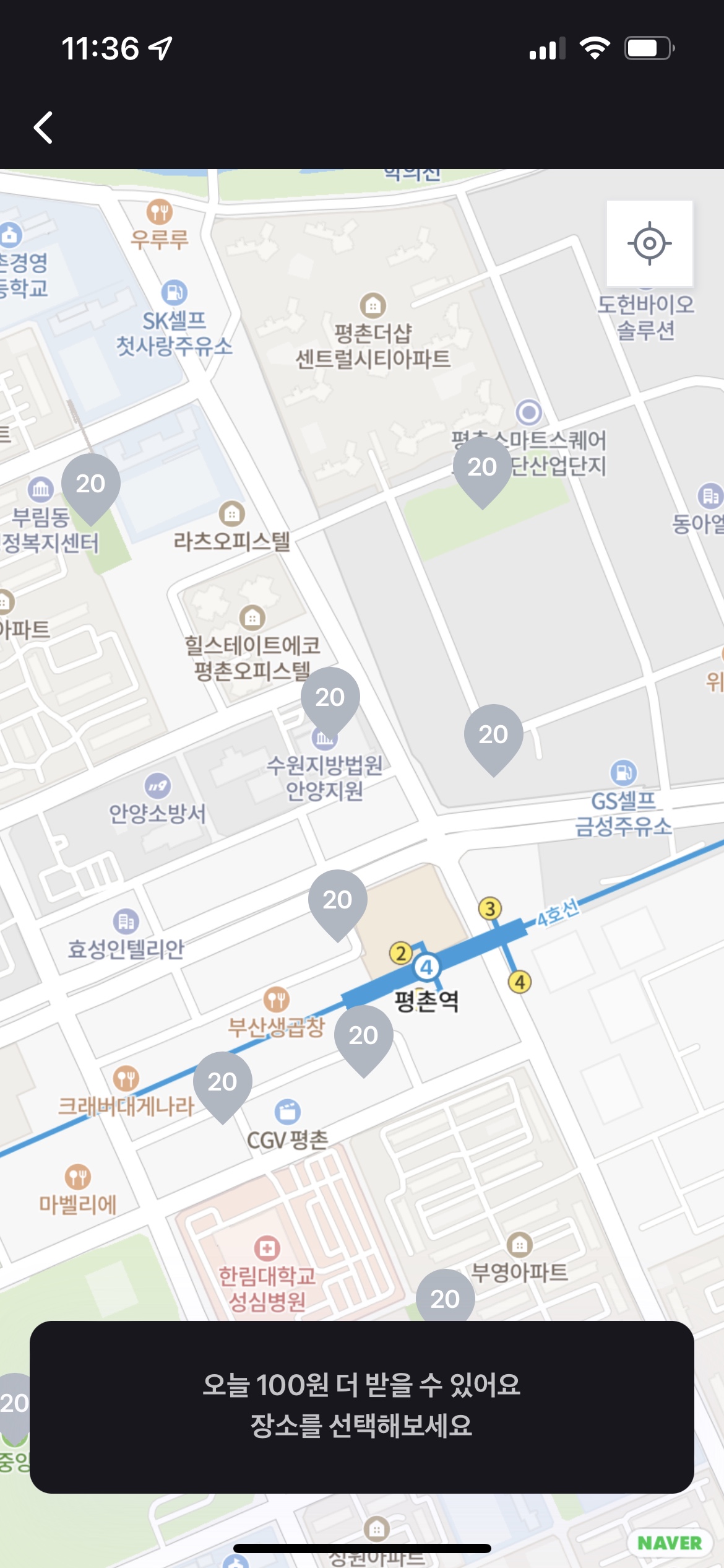 지도에서 포인트를 눌러보면 어디까지 걸어가면 되는지 정보를 보여줍니다. 현재 위치에서 몇 걸음을 걸어가야하는지 정보도 보여줍니다. 폰을 가지고 그 근처로 가면 포인트를 받을 수 있는 버튼이 활성화되고 역시 버튼을 누르면 20포인트가 적립됩니다.
