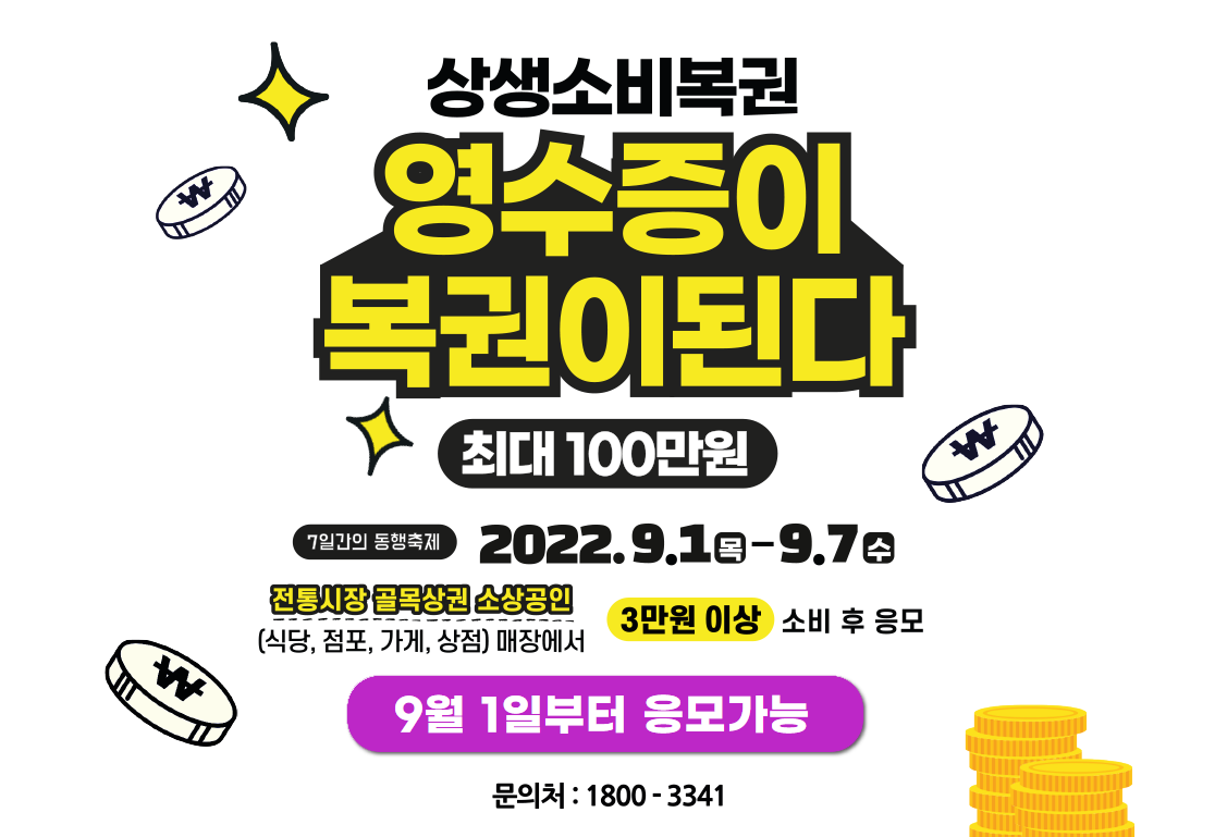 2022년 9월 1일부터 9월 7일까지 일주일간 전통시장 골목상권 소상공인 매장에서 3만원 이상 소비 후 응모하면 추첨으로 최대 100만원을 돌려주는 행사입니다