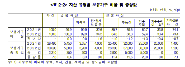가구가 보유한 평균 자산인 5억 4770만원 중에 금융자산은 1억 2126만원으로 약 22.1% 수준이었고, 실물자산은 77.9%인 4억 2646만원이었습니다. 아마도 부동산이 더 큰 비중이기 때문인 것 같습니다.