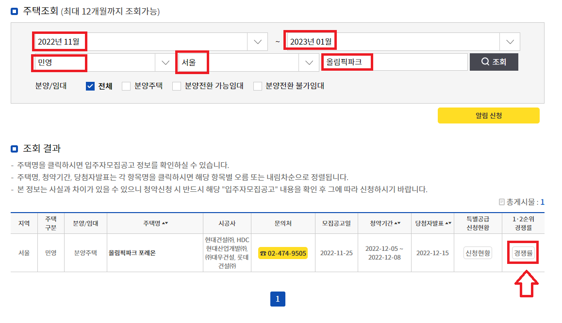 그런 다음 조회 버튼을 누르면 입력한 조건에 맞는 청약 정보가 '조회 결과' 섹션에 출력됩니다. 조회 결과에 하나의 청약 정보가 확인되는데요. 이 부분의 맨 오른쪽에 '경쟁률' 버튼이 있습니다. 이 버튼을 누르면 올림픽파크 포레온의 청약 경쟁률을 볼 수 있습니다.