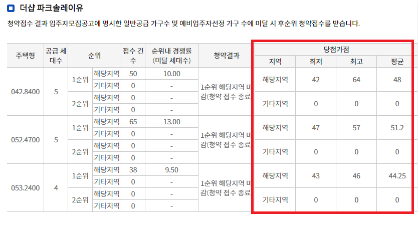 같은 표의 오른쪽에 당첨가점 정보를 확인할 수 있습니다. 해당 타입의 해당지역 혹은 기타지역에서 접수된 청약통장 중에 당첨된 통장들의 평균 가점, 최고 가점, 최저 가점 등을 확인할 수 있습니다. 청약 경쟁률과 더불어 당첨 커트라인 정보를 통해 청약 열기를 가늠해 볼 수 있습니다.
