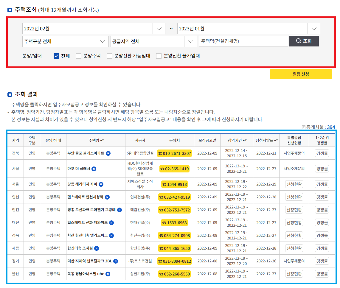 마지막으로 아파트 단지의 이름 같은 주택명 혹은 건설업체 명을 통해서 청약 정보를 찾을 수 있습니다.