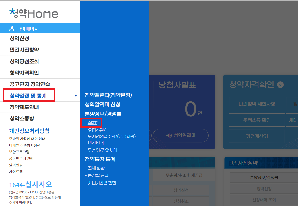 청약홈 홈페이지의 좌측을 보면 여러 메뉴들이 있습니다. 그 메뉴들 중에 '청약일정 및 통계' 메뉴를 선택합니다. 그리고 하위 메뉴 중 '분양정보/경쟁률' 메뉴 중에 APT 항목을 클릭합니다.