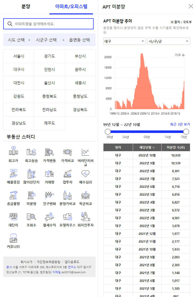 국토교통부 통계누리에서 제공하는 미분양 아파트 데이터는 다소 확인하기가 어려운데요. 이 정보를 기반으로 다양한 서비스들이 인사이트를 제공하고 있습니다.
