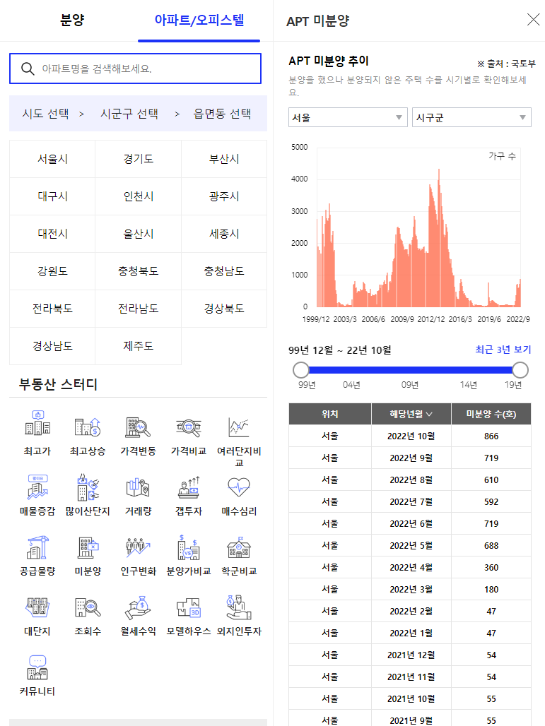 국토교통부 통계누리에서 제공하는 미분양 아파트 데이터는 다소 확인하기가 어려운데요. 이 정보를 기반으로 다양한 서비스들이 인사이트를 제공하고 있습니다.