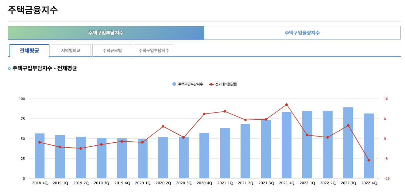 HAI 지수를 참고해서 한국주택금융공사가 매 분기마다 발표하고 있는 통계가 '한국형 주택구입부담지수(K-HAI)' 입니다. K-HAI 지수도 마찬가지로 중간소득 근로자가 중간가격대 아파트를 구입할 때의 대출상환 부담을 나타내는 지표입니다.