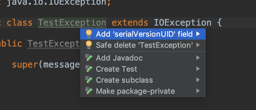 경고 메시지가 뜨는 클래스의 이름 부분에서 인텔리J의 'intention actions' 기능을 이용하면 쉽게 serialVersionUID를 추가할 수 있다. 경고 메시지가 뜨는 부분 (하이라이트 된 부분)에서 Mac의 경우 ⌥⏎ (option + enter) 버튼을 누르면 위 그림처럼 옵션을 선택할 수 있다. 'Add 'serialVersionUID field'를 선택하면 자동으로 추가된다. (그 밖에는 [Alt] + enter 버튼을 누르면 된다.)