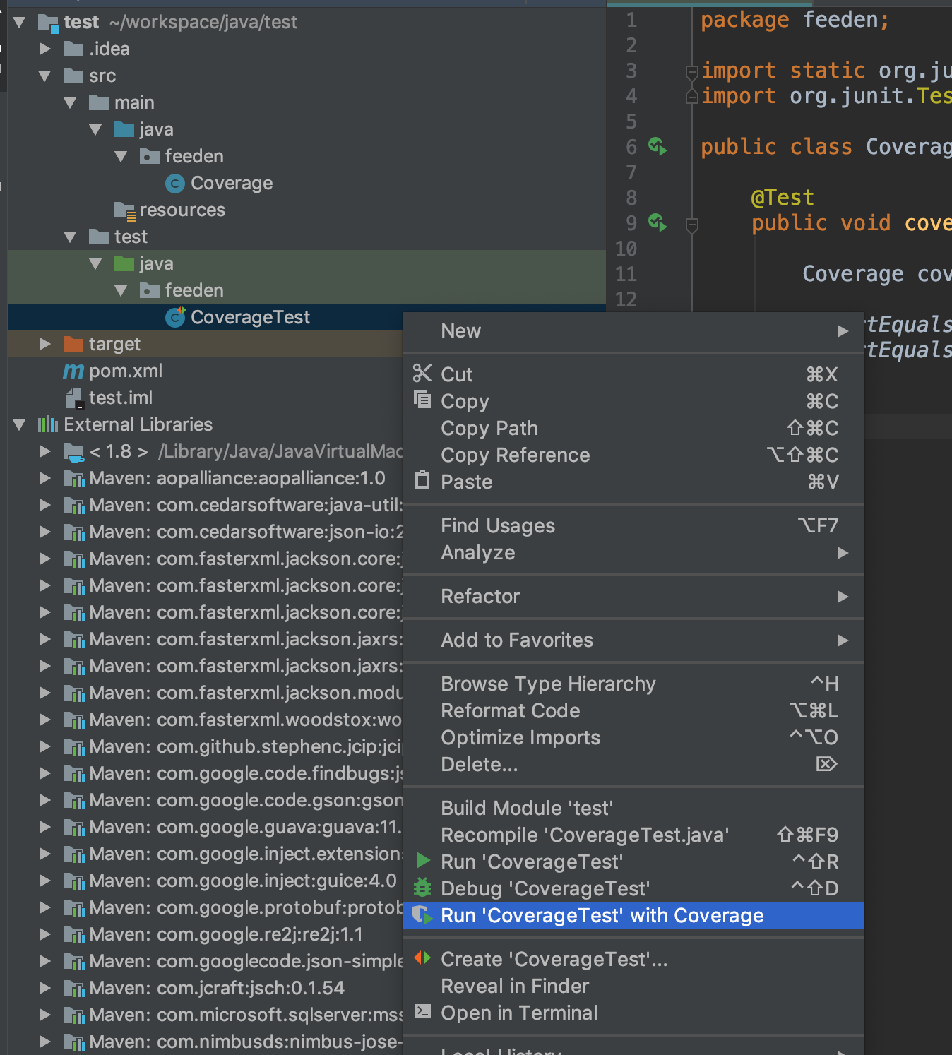 IntelliJ를 재시작하면 위 그림처럼 프로젝트 창에서 우클릭을 해서 커버리지 테스트를 실행할 수 있다.