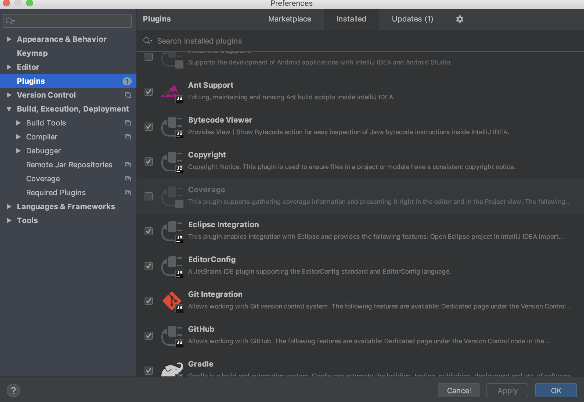 [Preferences] - "Plugins" 탭에서 "Coverage" 플러그인을 검색한다. 최신 버전의 인텔리 제이에서는 이미 번들로 설치가 되어 있으니 "Installed" 탭에서 "Coverage" 항목을 찾으면 된다.