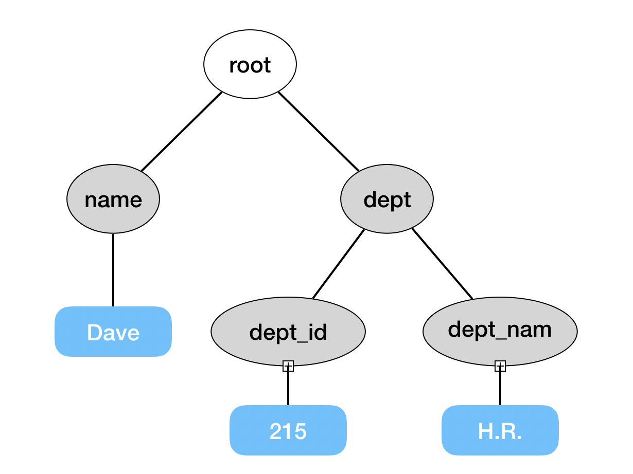 예를 들어 위와 같은 데이터 모델이 있을 때, ${name}는 트리의 루트 중, 'name'이라는 이름의 자식 노드가 가지고 있는 값을 가지고 와서 템플릿을 완성해준다. "dept.dept_name" 혹은 "dept.dept_id" 같은 표현식(expression)이 Interpolation에 있다면, Dot('.') 문자를 이용해서 여러 항목으로 우선 나눈다. "dept.dept_name"이라는 표현식은 "dept"와 "dept_name"이라는 항목으로 나뉘게 된다. 이는 루트의 자식중 "dept"라는 자식을 찾아서, 그 노드의 자식 중 "dept_name"이라는 자식을 찾고, 그 노드가 가지고 있는 값을 가져다 사용하겠다는 의미로 해석된다.