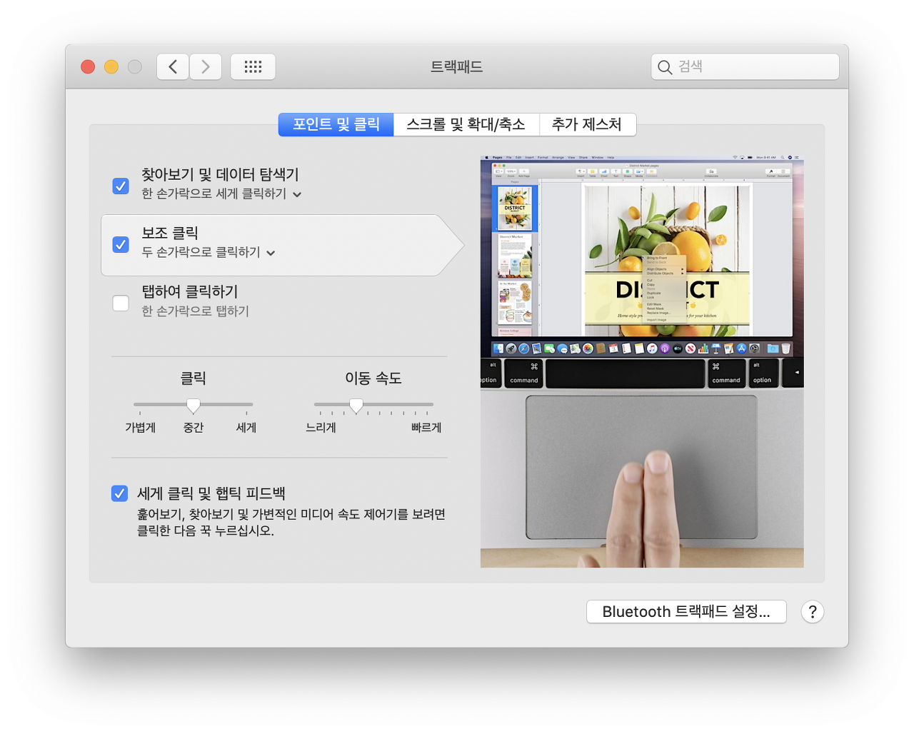 "세게 클릭 및 햅틱 피드백" 항목을 클릭해서 체크 박스를 해제하면, 트랙패드가 한번의 클릭만 인식하게 됩니다. 이 뿐만 아니라 클릭으로 인식하는 누름의 세기를 "가볍게", "중간", "세게" 중 하나로 설정할 수 있습니다.
