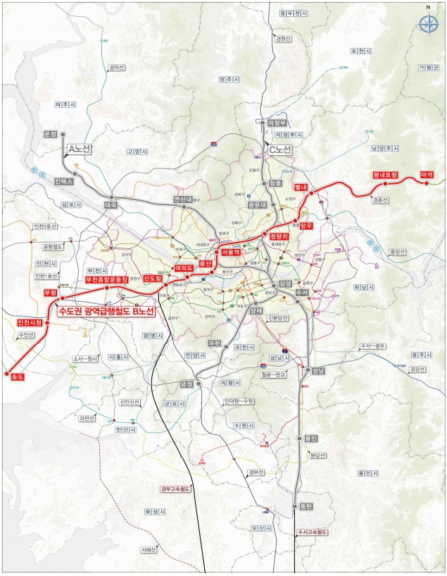 GTX-B 노선은 수도권을 8시에서 2시 방향으로 관통하는 노선입니다. 인천 송도에서 출발해 인천시청역, 부평역, 부천종합운동장역, 신도림역, 여의도역, 용산역, 서울역, 청량리역, 망우역, 별내역, 평내호평역을 거쳐 마석역까지 이어지는 노선입니다. GTX-A 노선과 마찬가지로 기존 역사들에 3기 신도시 택지인 왕숙신도시를 위한 왕숙역이 포함되었습니다. 경제성을 위해서 망우역에서 마석역 구간은 경춘선 선로를 공유하도록 했습니다. (그래서 GTX-B 노선을 춘천시까지 연장해달라는 요구도 있....)