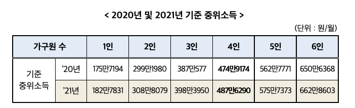 2021년도 기준 중위소득은 4인 가구 기준 487만 6290원으로 작년의 474만 9174원보다 2.68% 인상되었습니다.
