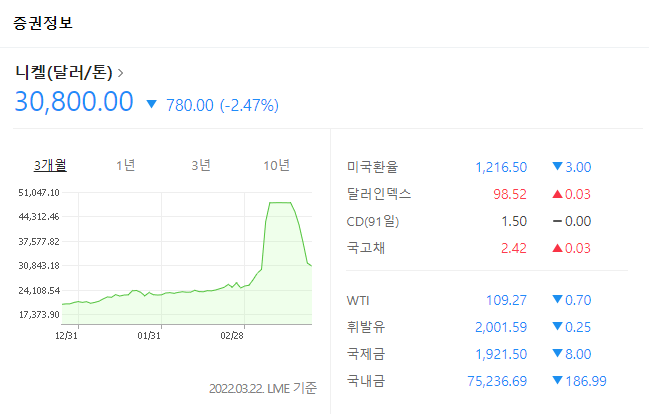 하지만 7%를 가지고 니켈 가격이 100% 가량 올라가지는 않는데요. 중국 최대 스테인리스 스틸, 니켈 생선 업체인 칭산 그룹이 니켈 선물에다가 공매도를 때린겁니다. 2021년 연말 즈음부터 슬금슬금 니켈 가격이 오르고 있었는데요. 그 동안 스테인리스 스틸에 주로 사용되었던 니켈이 하이니켈 배터리 소재로도 많이 사용되면서 수요가 늘어났고, 가격이 오른 것이죠.
