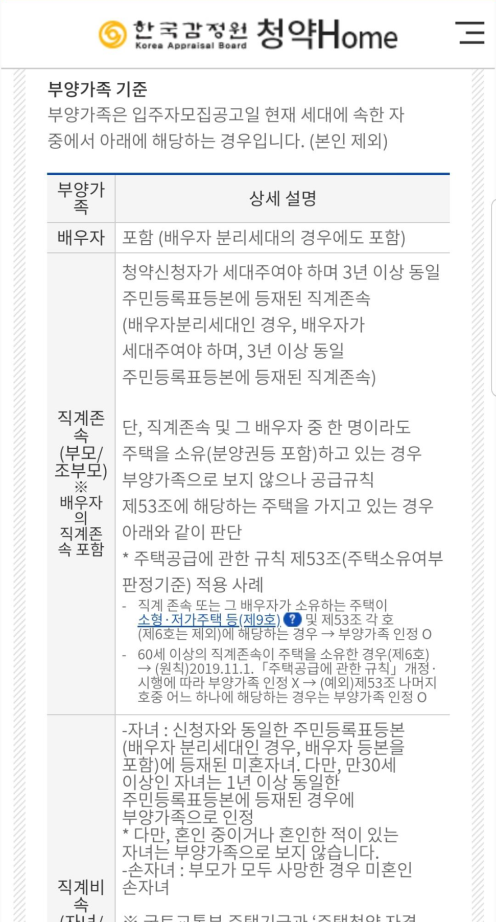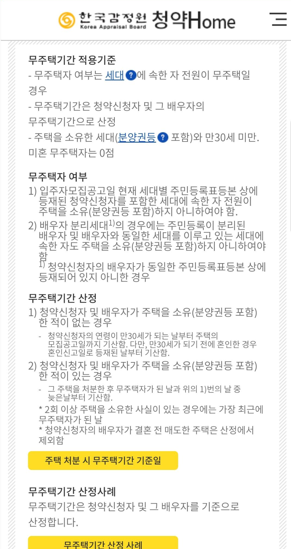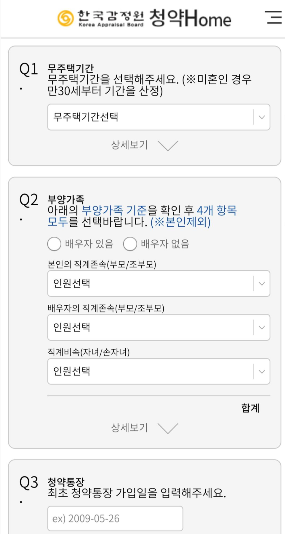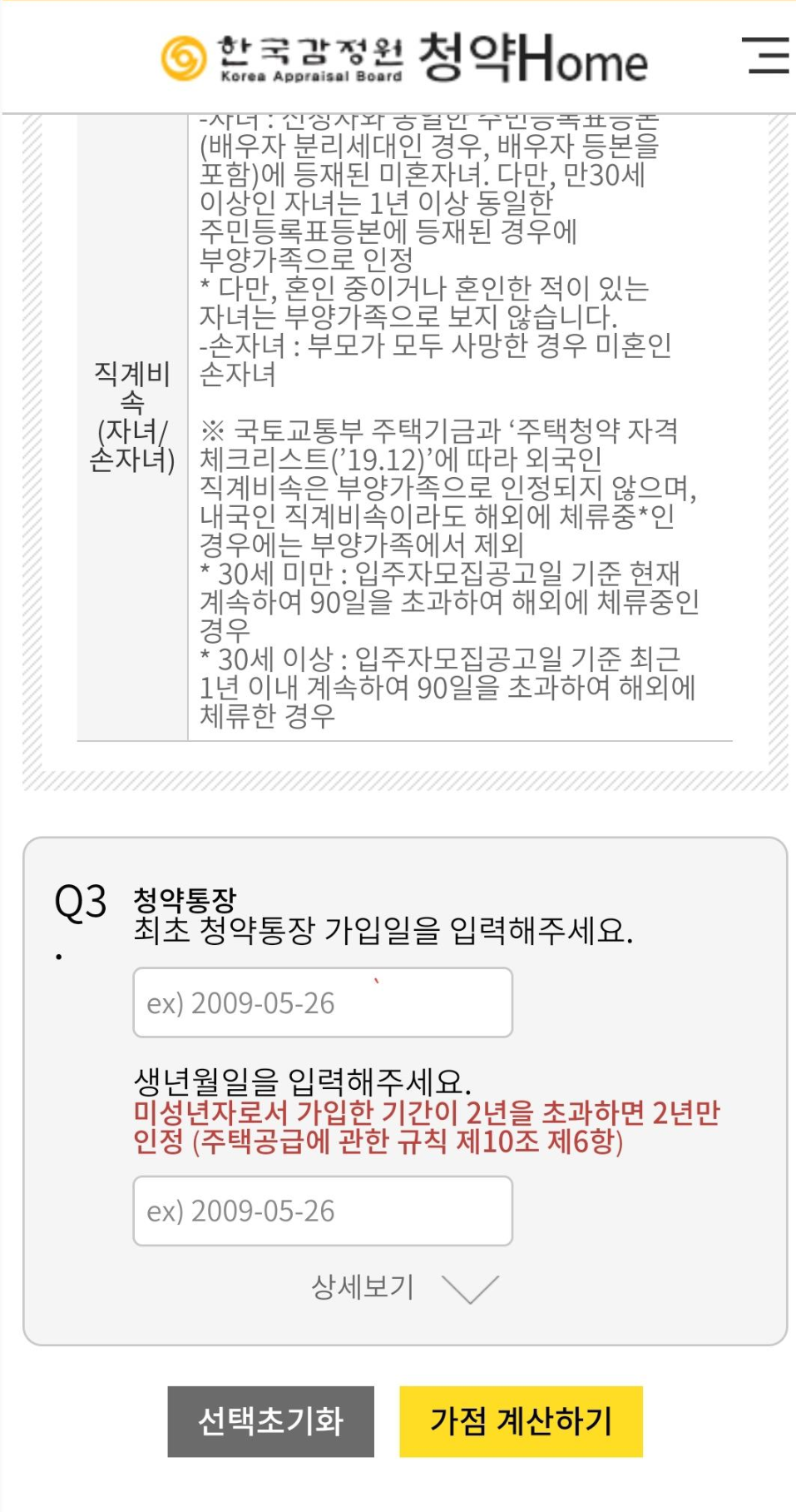 가점 계산에 필요한 정보들을 입력하면 입력해야할 정보에 대한 가이드가 나옵니다. 무주택 기간을 산정하는데 기준은 어떤 것이 있고 부양가족에는 어떤 경우가 포함되는지 친절하게 설명해줍니다. 정확히 잘 알아보고 입력해야 나중에 당첨이 취소되는 일이 없습니다.