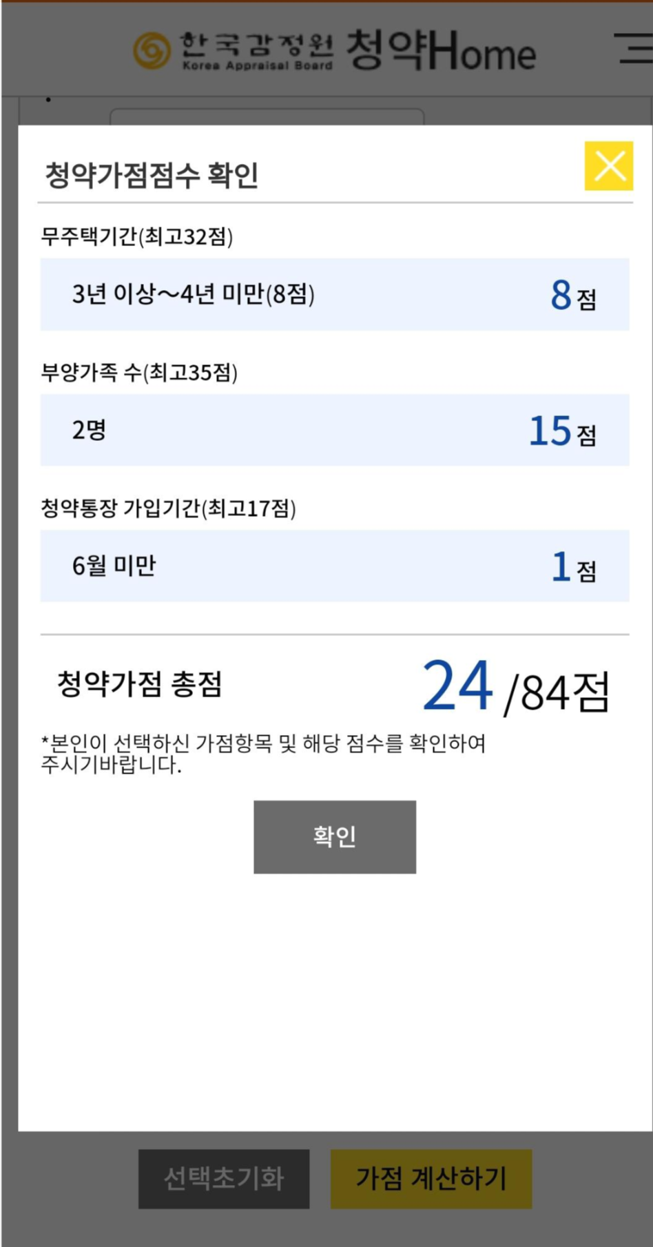 '가점 계산하기' 버튼을 누르면 청약 가점이 계산됩니다.