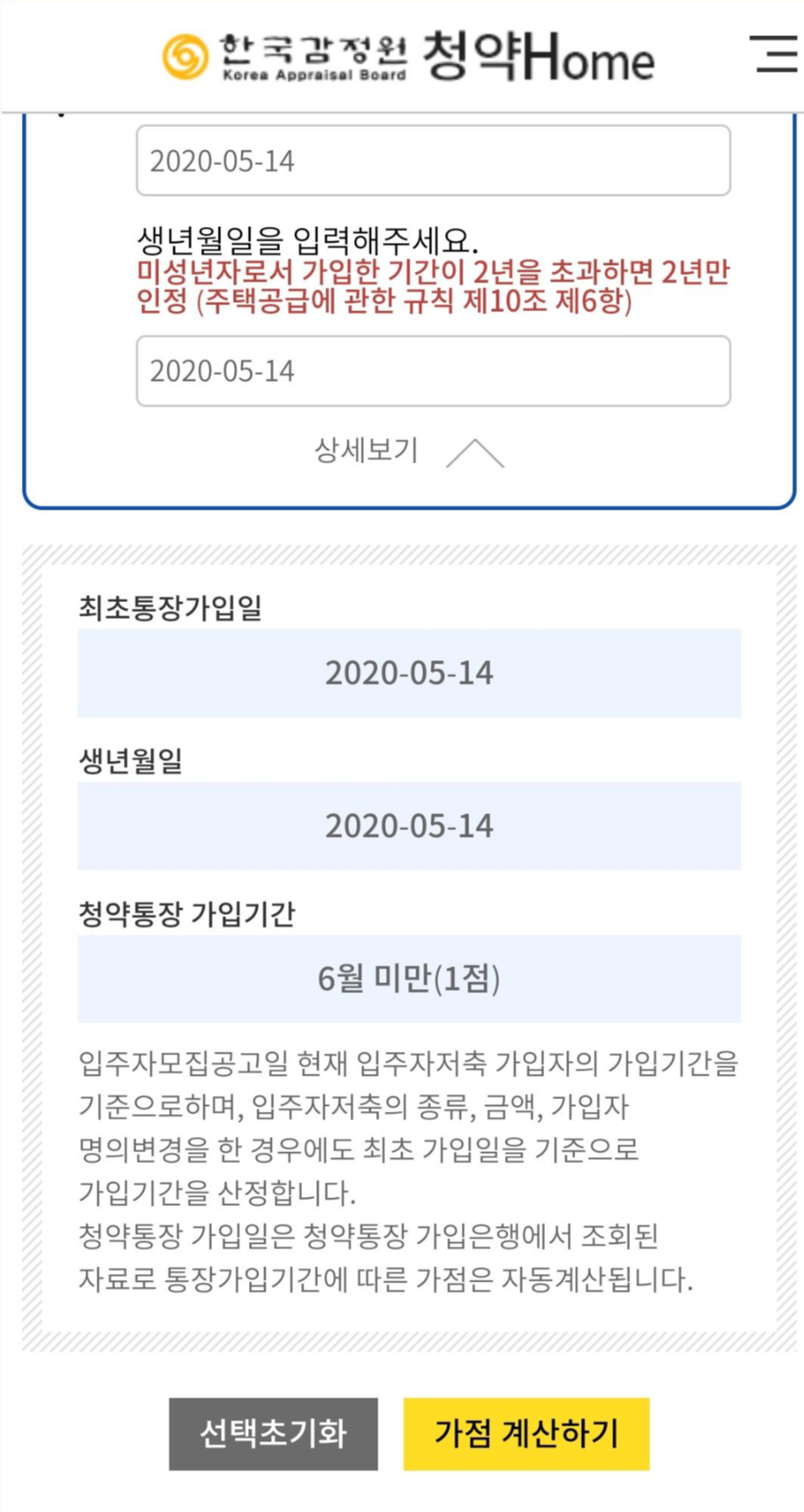마지막으로 아까 확인한 청약통장 가입 기간 정보를 입력하면 최초통장가입일과 생년월일, 가입기간에 따른 가점 정보가 출력됩니다.