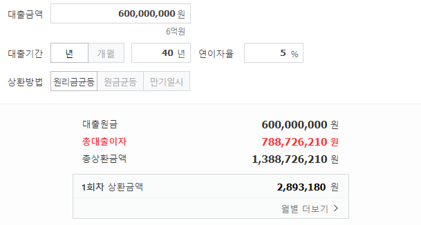 6억원을 30년동안 4% 이자로 빌리면 대출원금 6억원에 총 납부 이자가 4억 3100만원 정도입니다. 금리가 5%로 오르면 총 납부이자는 5억 6천만원 가량으로 높아집니다.