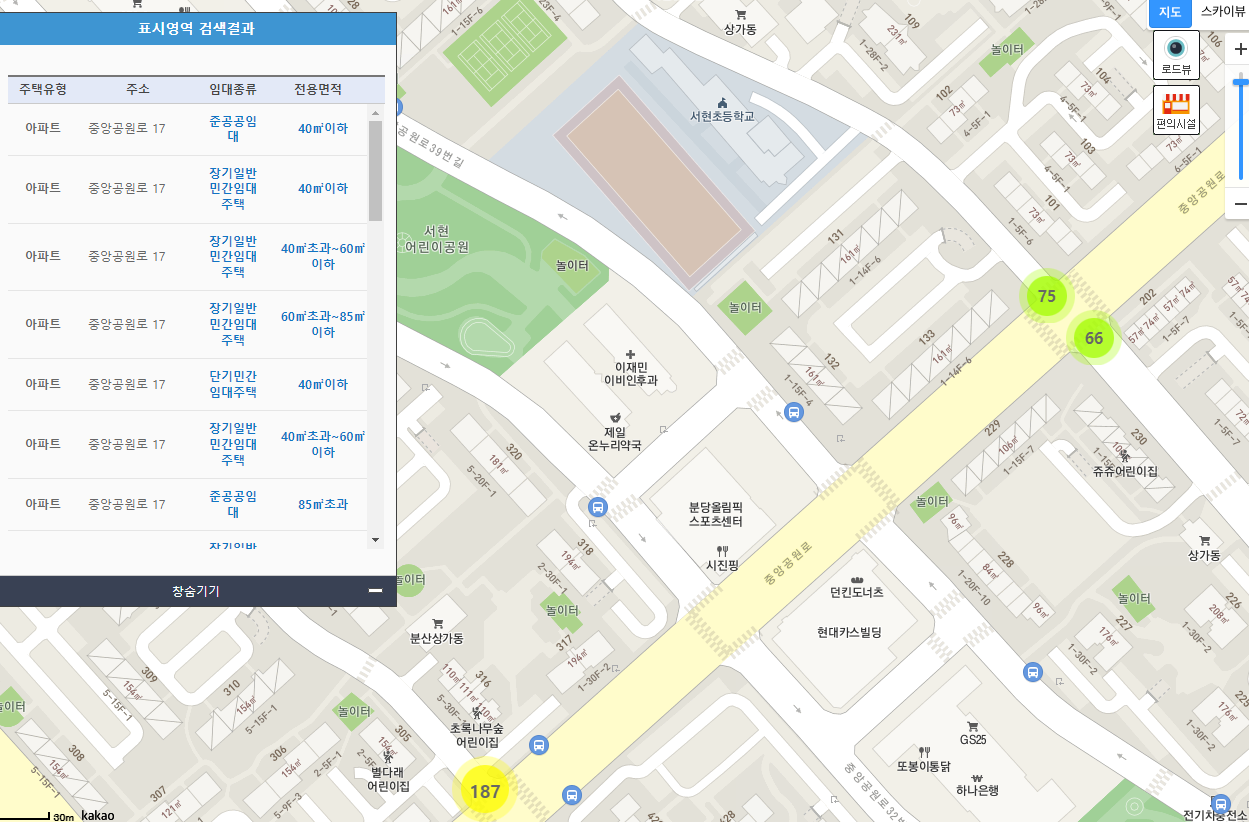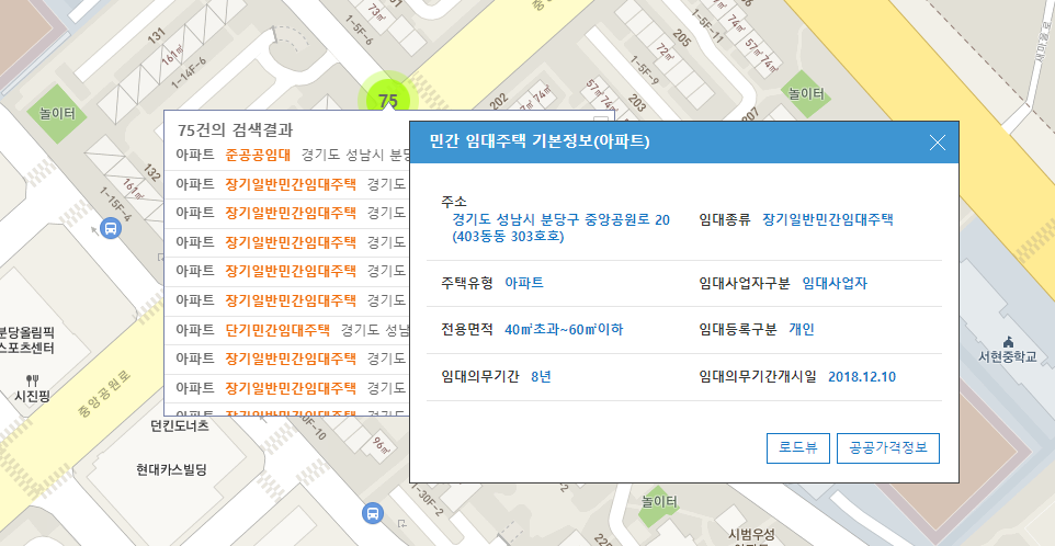 이게 그 동네에 임대사업자로 등록한 임대인의 임대주택들 목록입니다. 숫자를 클릭하면 임대주택들의 목록이 표시됩니다.