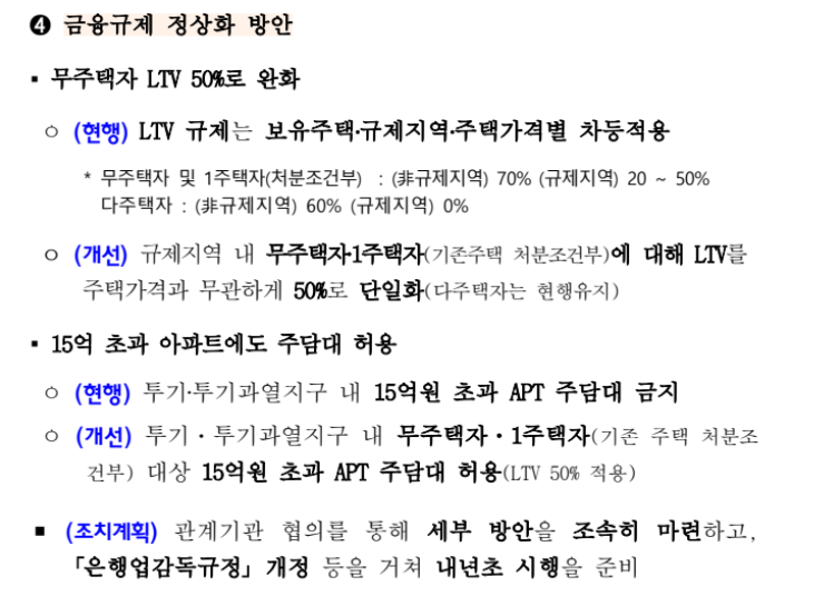 결국 풀린다는 얘기가 많았었는데 15억원 초과 아파트에 대한 주담대도 해제되었습니다. 무주택자와 1주택자에 한해 15억을 넘는 아파트에 대한 주택담보대출이 허용됩니다. 또 한, LTV 규제도 무주택자와 1주택자에 한해 투기지역이더라도 LTV를 50%까지 허용합니다. 즉, 소득만 된다면 16억짜리 아파트를 구입할 때 8억의 대출을 일으켜서 구입할 수 있다는 의미입니다. 물론 다주택자는 현행 규제를 유지합니다.