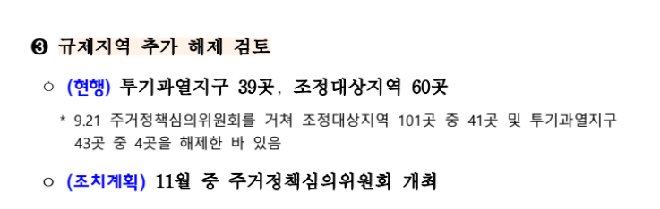 현재 39곳의 투기과열지구와 60곳의 조정대상지역이 있는데요. 11월 중에 주거정책심의위원회를 개최하여 추가로 규제 지역을 해제할 예정이라고 합니다.