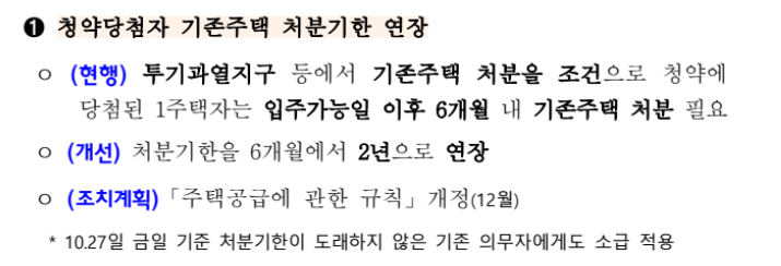 이 조치는 기존 의무자에도 소급 적용될 예정입니다. 즉, 대책이 발표되기 전에 분양을 받은 1주택자도 6개월이 아닌 늘어난 기간이 적용될 예정입니다.