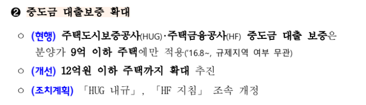 이번 대책으로 중도금 대출 규제 상한이 9억원에서 12억원으로 상향되었습니다. 따라서 서울 내 많은 아파트 청약에서 분양을 받으신 분들이 자금을 조달하기 편해졌습니다. 이 덕분에 아마도 청약 시장에서는 경쟁률이 조금은 더 올라가고 미분양도 줄어들지 않을까 생각됩니다.