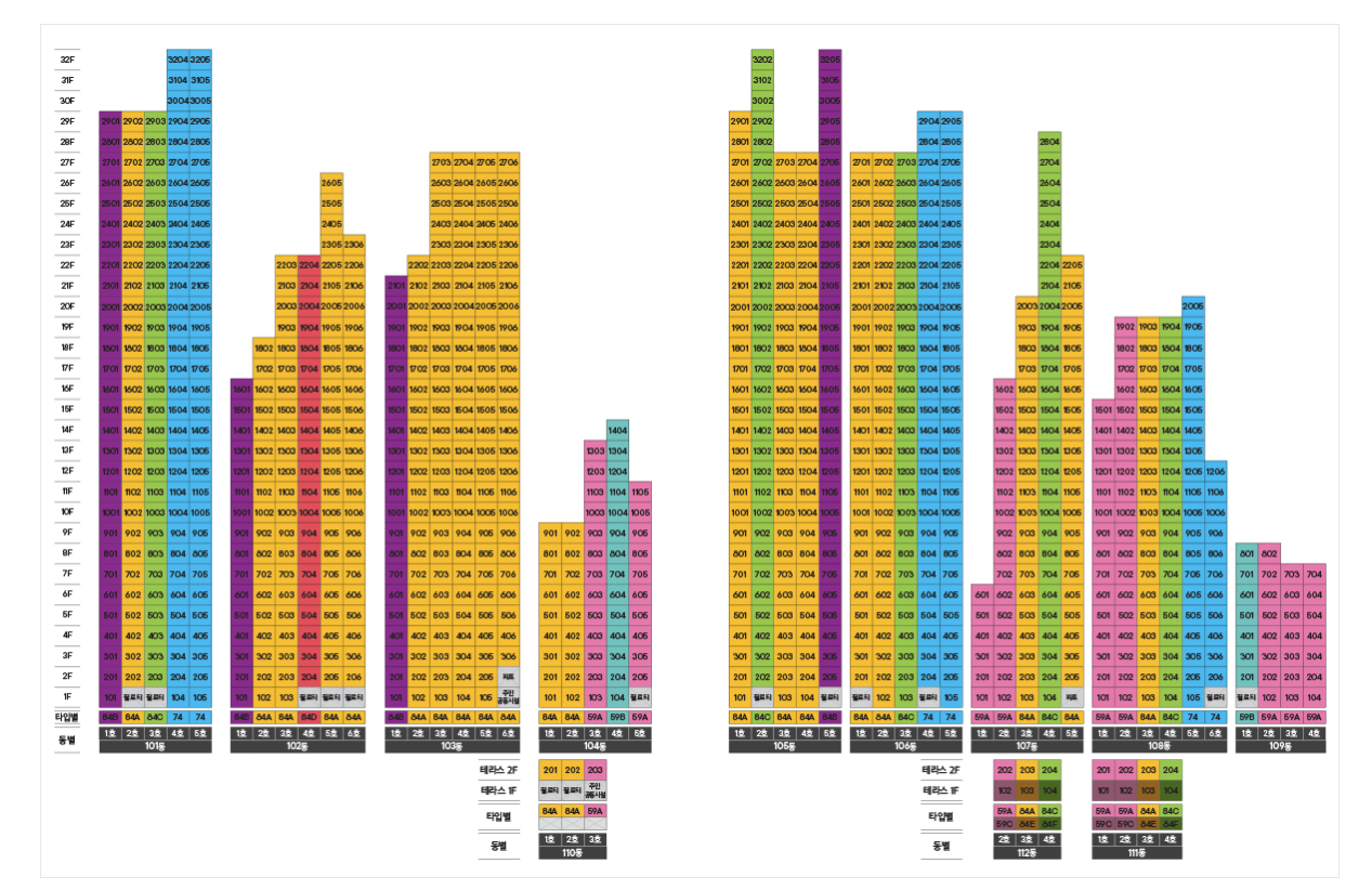 e편한세상 용인역 플랫폼시티의 단지는 아래와 같이 배치되어 있습니다. 평형별 위치는 색상으로 구분하시면 됩니다.