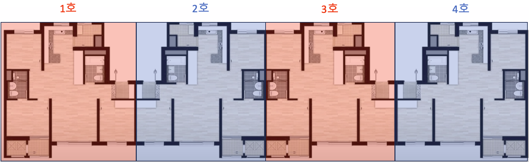 물론 혼합형이라고해도 남동과 남서향으로 세대당 채광 방향이 나뉘기 때문에 소비자의 선택에 따라 선호도가 갈린다는 점은 동일합니다.