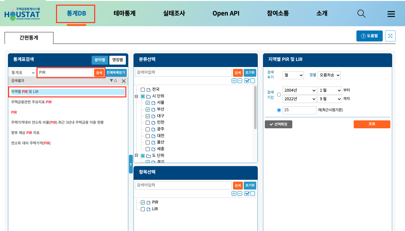 주택금융통계시스템의 상단 메뉴에서 '통계 DB' 탭을 클릭한 다음 통계표검색에서 'PIR'을 키워드로 넣어주고 검색합니다. 검색 결과 중에서 '지역별 PIR 및 LIR' 항목을 클릭합니다.