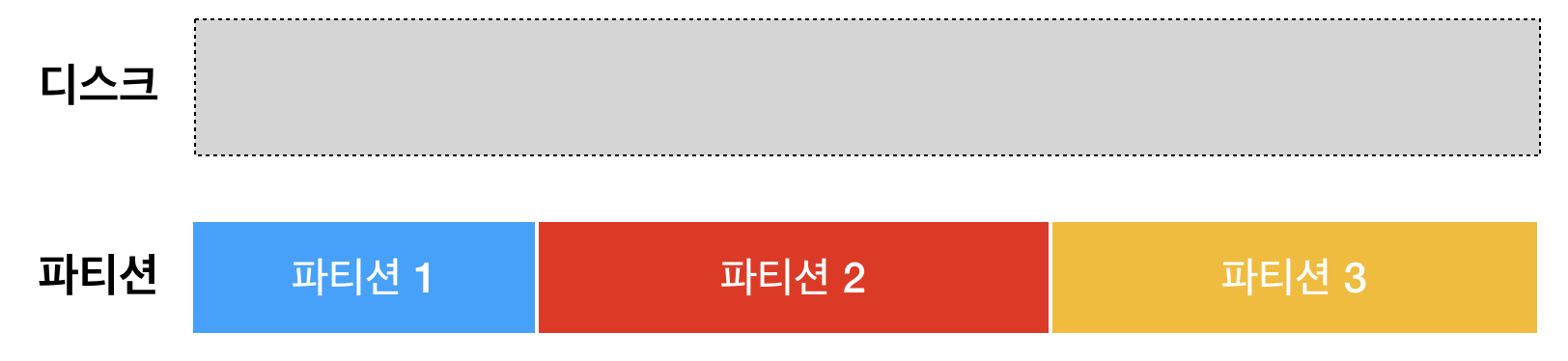 하나의 물리적인 저장 장치를 여러 개의 독립적인 저장 장치처럼 사용할 수 있게 구분해주는 역할을 한다. 위 그림에서 보면 하나의 디스크를 3개의 파티션으로 나누어 3개의 저장 장치처럼 사용할 수 있게 해 준다.