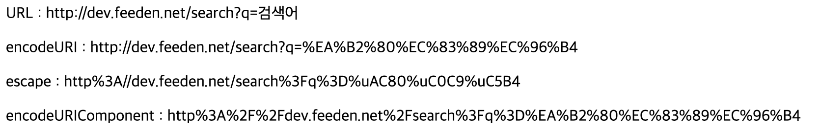 URL에 사용할 특수 문자들을 처리하기 위해 encodeURI(), encodeURIComponent(), escape() 함수를 사용 할 수 있다. 각 함수들의 차이점은 다음과 같다.