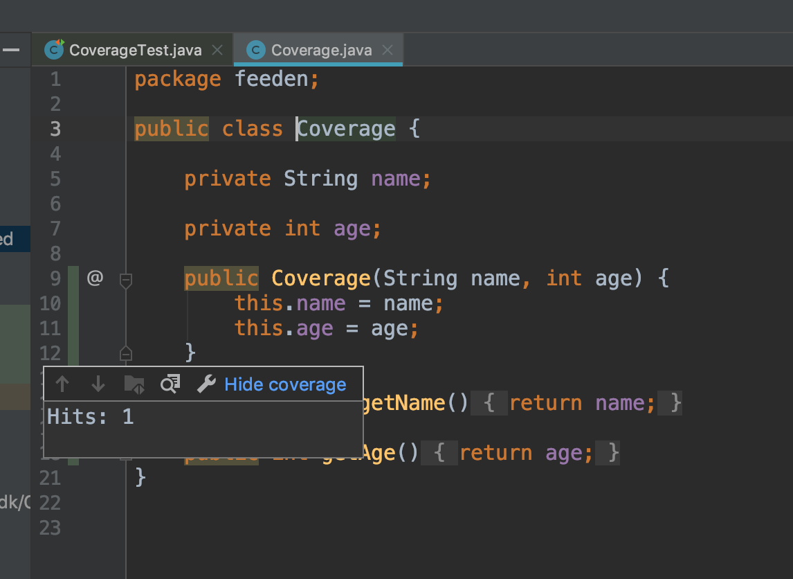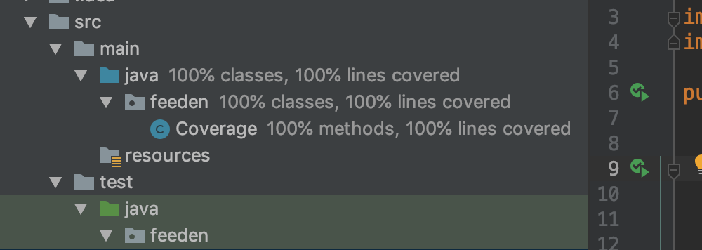 소스코드 창 옆에는 녹색으로 커버리지가 확인됨이 나타난다.