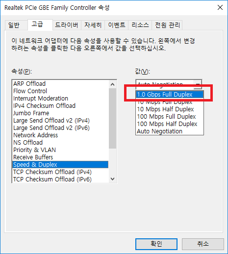 컨트롤러 속성을 볼 수 있는 창의 [고급] 탭을 누르고, "속성(R)" 중에 'Speed & Duplex' 항목을 선택하면 위와 같은 창이 뜬다.