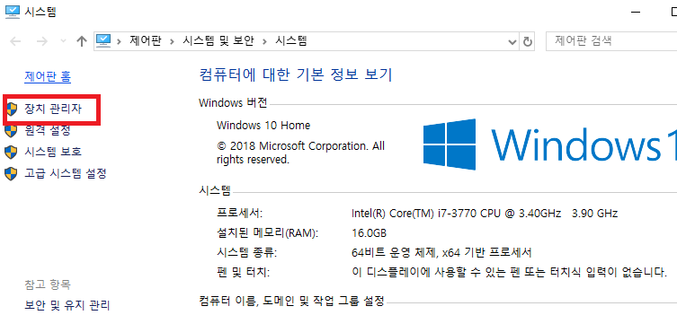 1. [윈도우키] + [Pause] 키를 눌러 시스템 정보창을 띄운다.